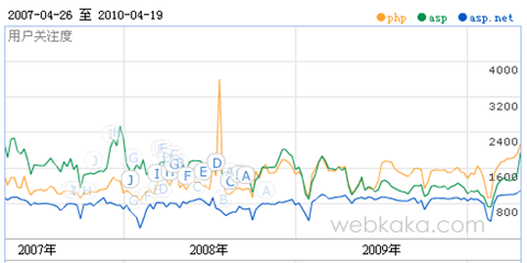 ????? 上圖為近3年的php,asp,asp.net用戶關(guān)注度比較,從圖中曲線圖看出,php在2008年下半年開始受更多用戶關(guān)注,從2008年下半年到 2009年上半年,php與asp不分上下,受關(guān)注程度幾乎是一樣,而從2009年下半年開始,php受用戶關(guān)注度已經(jīng)明顯超過了asp,而 asp.net的用戶關(guān)注度僅僅為php的1/2。
