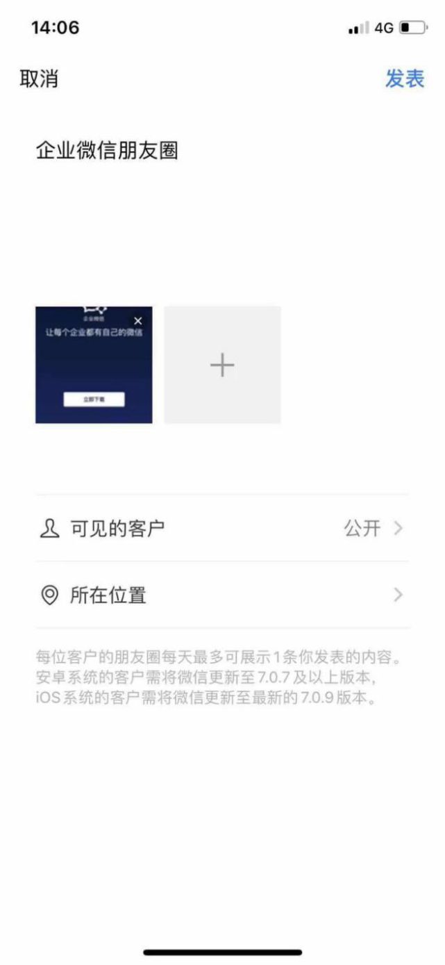 客戶朋友圈申請完成后,企業(yè)就需要發(fā)客戶朋友圈了,這個時候按照同樣的方法點擊客戶朋友圈就可以發(fā)了,企業(yè)微信朋友圈和個人微信朋友圈的頁面基本相似,并且也可以設(shè)置部分客戶群可見,并且發(fā)送的內(nèi)容也大同小異,既可以發(fā)送文字,也可以發(fā)送圖片,視頻等,只要會發(fā)個人朋友圈就可以輕松完成企業(yè)朋友圈的發(fā)布。