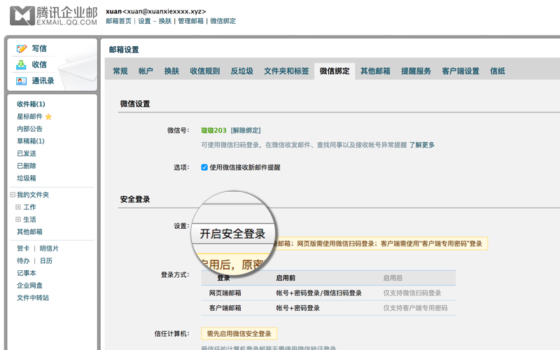 開啟后,將進(jìn)一步保障你的帳號(hào)安全,登錄方式升級(jí)為:網(wǎng)頁端登錄需使用微信掃碼;客戶端登錄需使用“客戶端專用密碼”,?更有效保障你的郵箱安全。