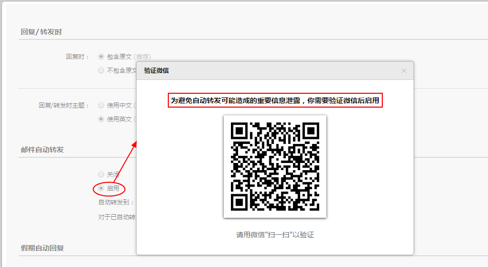 2.已綁定微信的用戶,需要驗(yàn)證微信后才能啟用自動轉(zhuǎn)發(fā),如下圖: