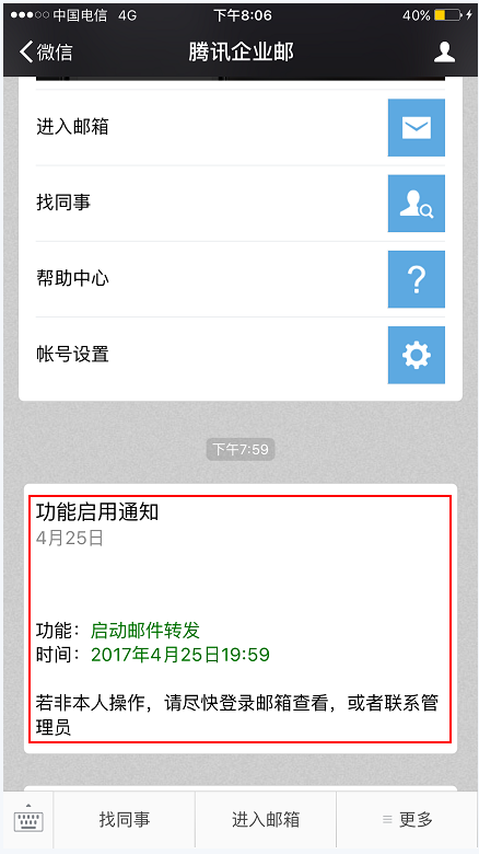 3.成員綁定的微信會收到已啟用自動轉(zhuǎn)發(fā)功能的提醒消息,如下圖: