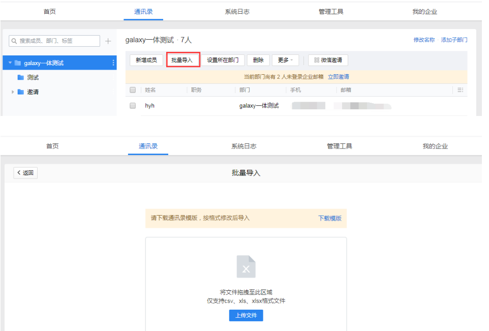 通訊錄-批量導(dǎo)入,下載批量導(dǎo)入模板,按照模板內(nèi)指引填寫信息,并導(dǎo)入到指定部門。成功導(dǎo)入后選擇邀請(qǐng)會(huì)下發(fā)手機(jī)短信, 通知成員登錄郵箱。