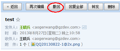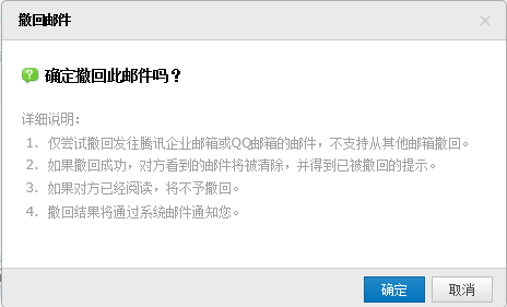 對于已發(fā)送的郵件,可以嘗試進(jìn)行撤回(僅限發(fā)往QQ郵箱的郵件,并在對方閱讀之前)。如果撤回成功,對于被撤回者而言,看到的郵件將變?yōu)槟衬持黝}的郵件已被撤回的提示,原先的內(nèi)容和附件將被清除。