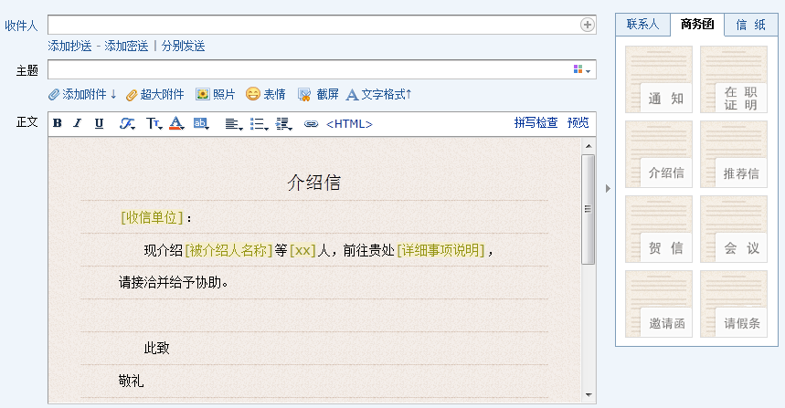 商務(wù)函功能預(yù)置了常見的企業(yè)公文模板,幫助您撰寫商務(wù)郵件。您可以點(diǎn)擊選擇模板類型,郵件正文會(huì)自動(dòng)替換成該商務(wù)函,點(diǎn)擊模板文字,輸入文字即可自動(dòng)替換。