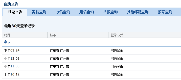 可以自助查詢到登錄、發(fā)信、收信、刪信、舉報(bào)、其他郵箱管理、搬家信息