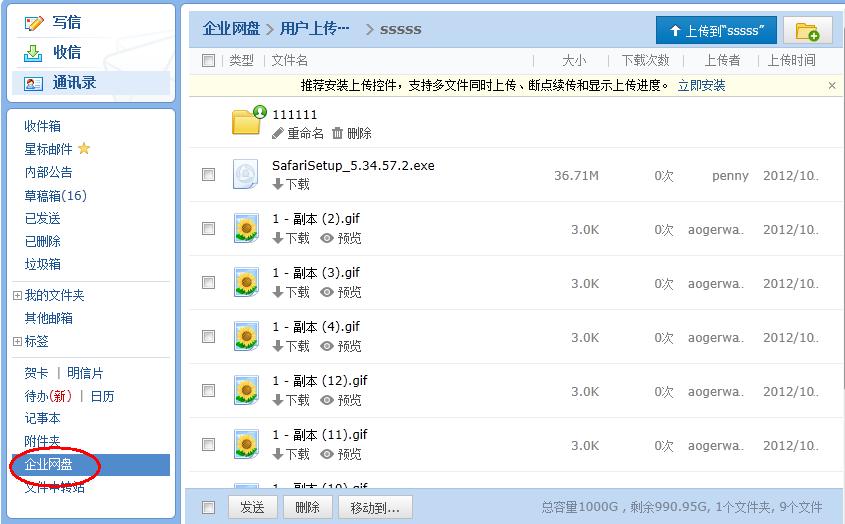 企業(yè)網(wǎng)盤是一種供企業(yè)內(nèi)部共享文件的存儲(chǔ)服務(wù)。員工上傳公司文檔、照片到企業(yè)網(wǎng)盤中,其他企業(yè)員工就能隨時(shí)隨地在企業(yè)郵箱中訪問這些文件了。