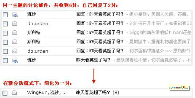 簡化郵件列表,同一主題產(chǎn)生的多封往來郵件,會(huì)轉(zhuǎn)化為一封會(huì)話郵件;