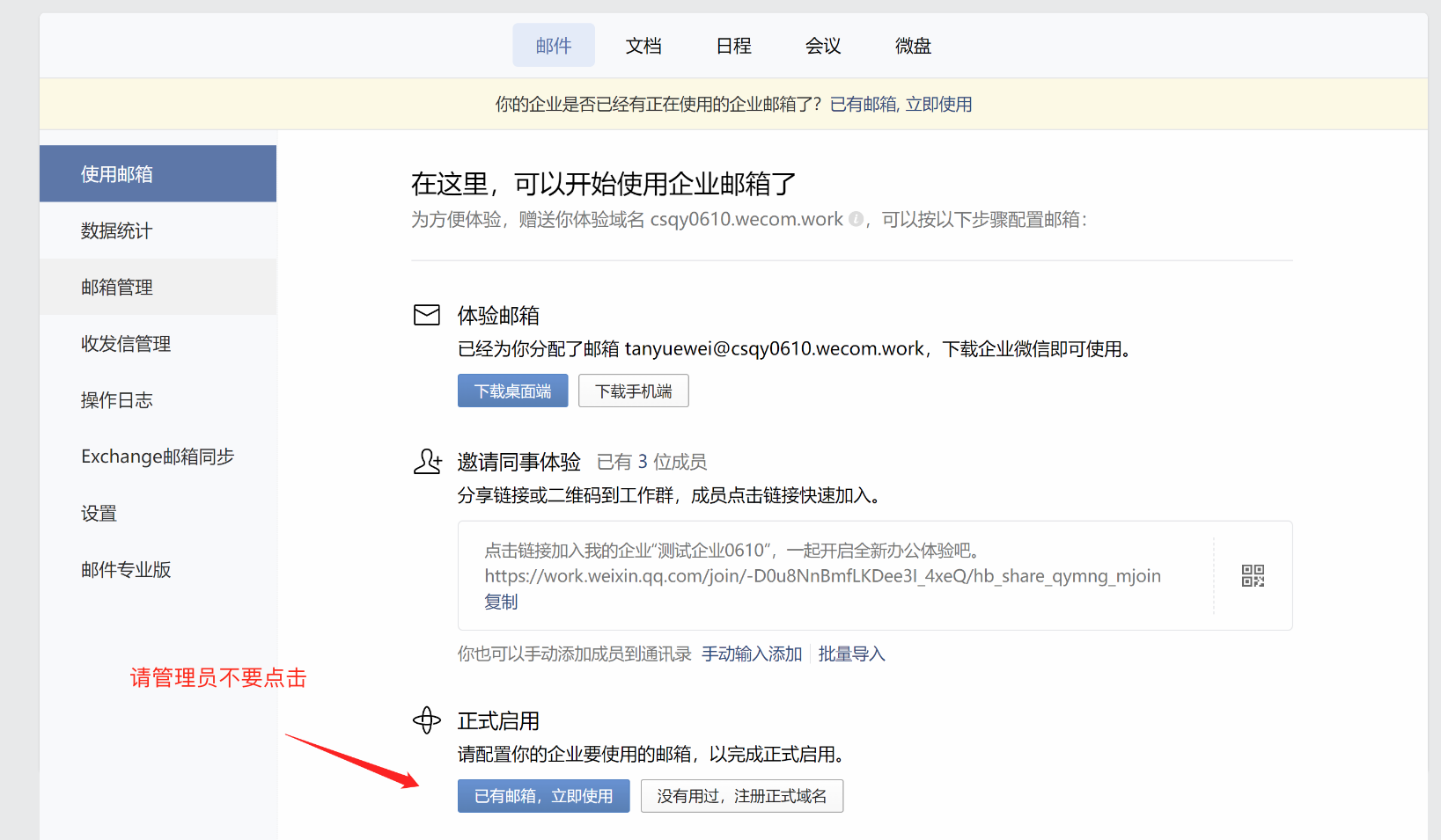 請(qǐng)管理員不要在以下頁(yè)面,進(jìn)行域名的綁定操作。這會(huì)導(dǎo)致原來(lái)的郵箱數(shù)據(jù)丟失。后續(xù)騰訊研發(fā)團(tuán)隊(duì)將會(huì)支持將企業(yè)郵箱整體遷移到企業(yè)微信,以替換體驗(yàn)域名。希望將郵箱和企業(yè)微信統(tǒng)一合并管理的企業(yè)可聯(lián)系我司銷售登記,后續(xù)排期升級(jí)。目前由于產(chǎn)品還在測(cè)試階段,不建議升級(jí)。
