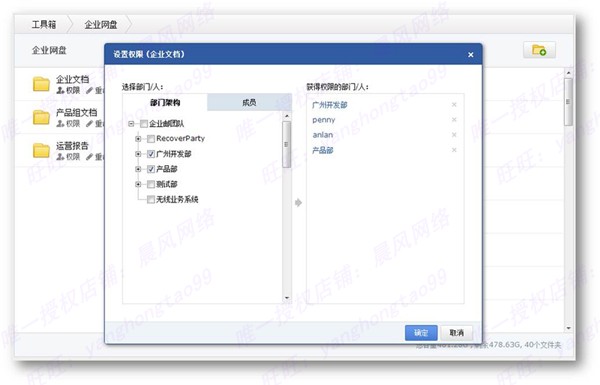 ?????企業(yè)網(wǎng)盤是用于企業(yè)內(nèi)部共享文件的網(wǎng)絡(luò)硬盤,成員上傳文件至企業(yè)網(wǎng)盤后,企業(yè)的其他員工即可看到該文件,例如上傳一些公司的集體活動(dòng)照片,公司的制度文檔等需要共享的資源,成員登陸郵箱后可下載分享,也可以對(duì)企業(yè)成員設(shè)置權(quán)限分配。將根文件夾分配給不同的部門,或成員使用。